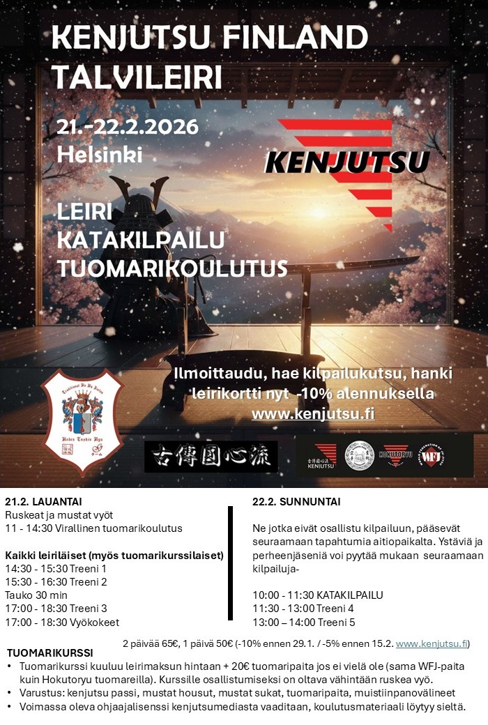 Kenjutsun valtakunnallinen talvileiri järjestetään Helsingissä 21.–22.2.2026. Leiri on tarkoitettu kaikille